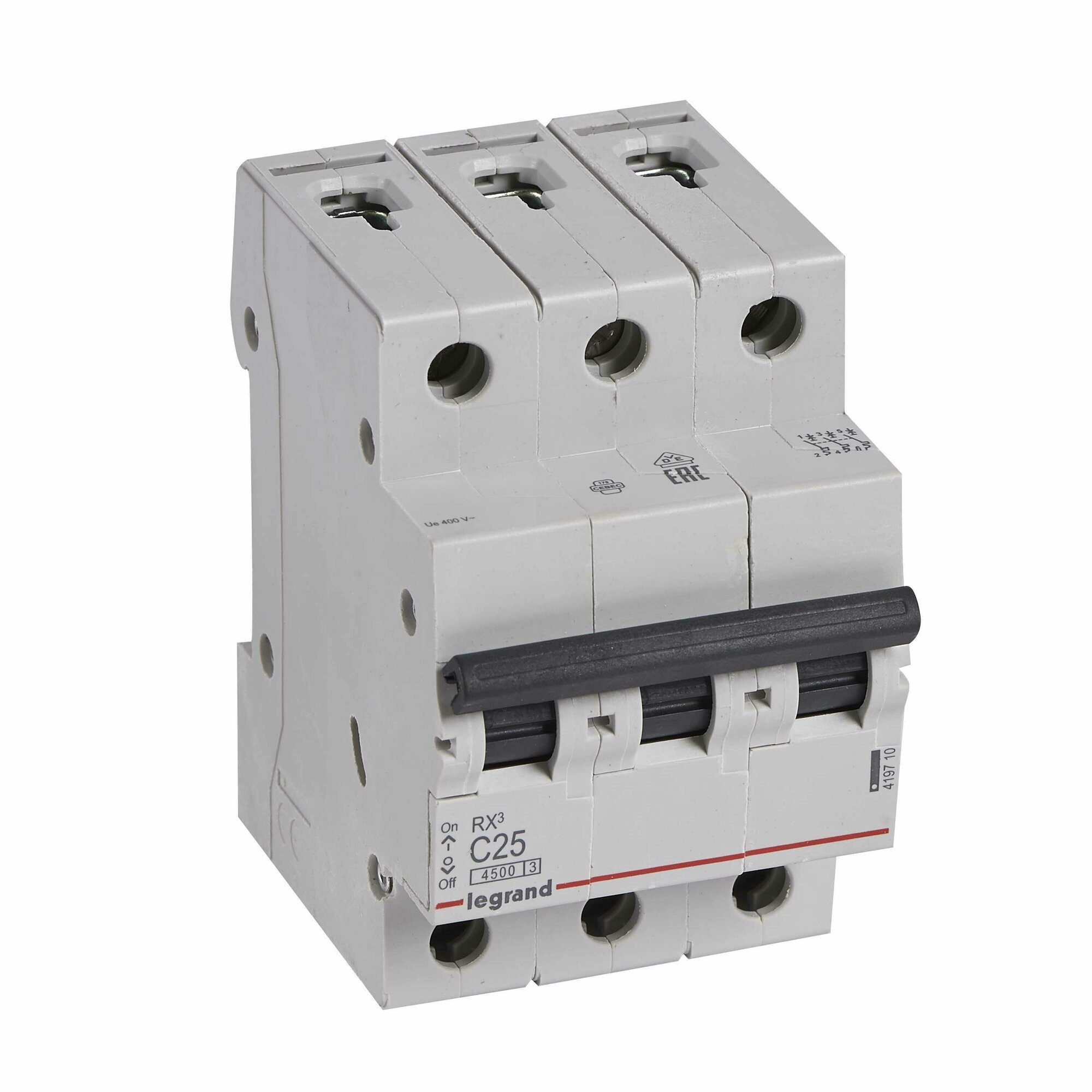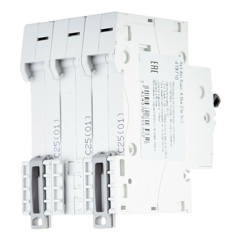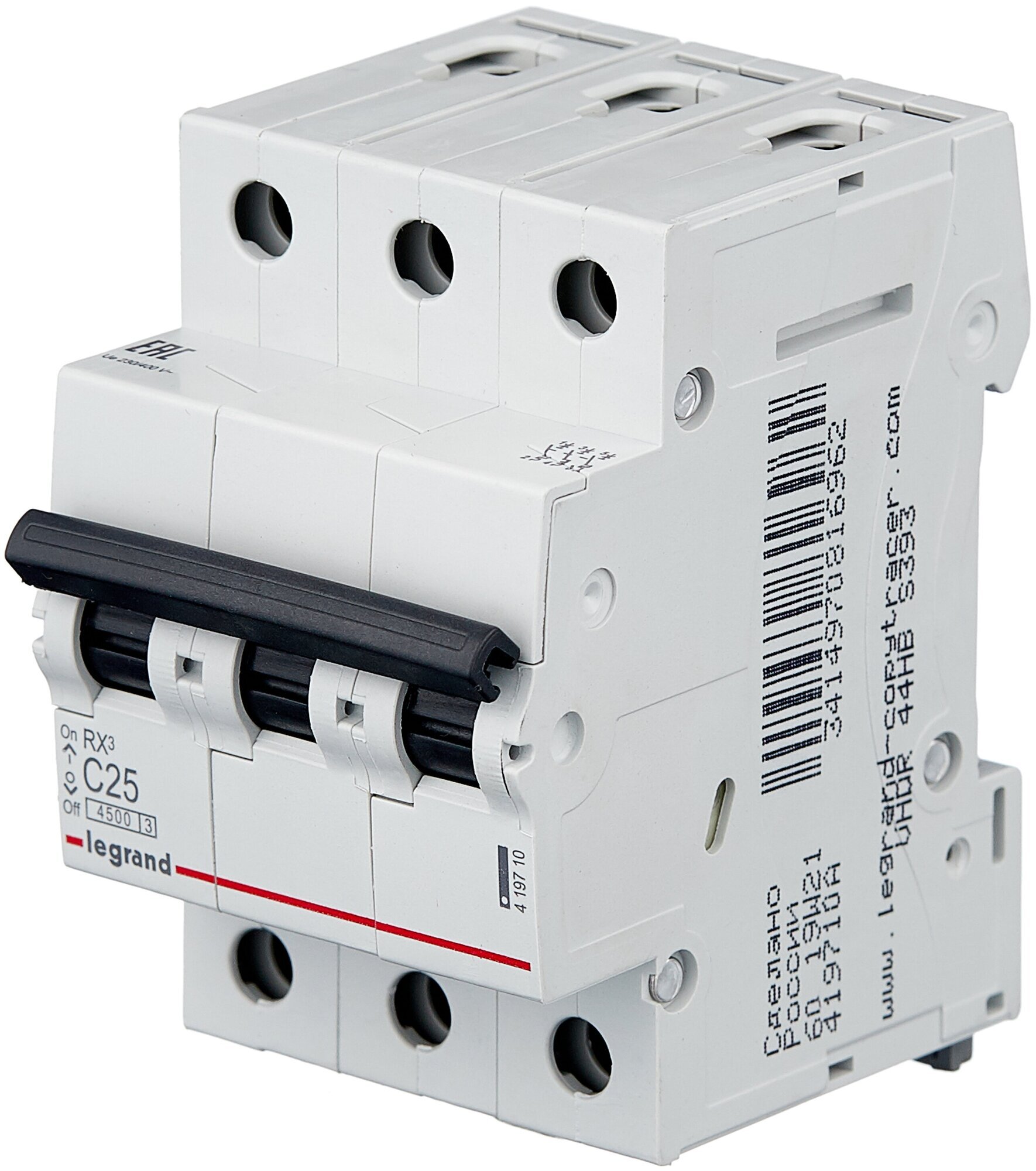 Трехполюсный автоматический выключатель Legrand RX3 типа C, рассчитанный на ток нагрузки 25 А и максимальную силу тока (отключательную способность) 4,5 кА предназначен для защиты электроприборов от поломок при перегрузках электросети или коротком замыкании. Устройство замеряет показатели электрического тока в непрерывном режиме и в случае его превышения срабатывает расцепитель, который размыкает электрическую цепь. Автомат устанавливается в специальных электрощитках в жилых домах, офисных и производственных помещениях. Параметр отключающей способности трехполюсного автомата Legrand RX3 (4,5 кА) означает максимальную силу тока, при которой срабатывает автоматический выключатель. При превышении этого показателя корректная работа автоматики не гарантируется. Для грамотного выбора устройства по отключающей способности необходимо учитывать максимально возможный ток при коротком замыкании. В старых постройках используются приборы на 4.5, либо 6 кА. Для квартиры в новых домах стоит выбрать защитную автоматику на 10 кА. Обратите внимание: несмотря на похожую единицу измерения и одинаковые числовые значения, номинальный ток и отключающая способность – это разные показатели! Автоматические выключатели типа C наиболее распространены в бытовых сетях. Для того, чтобы произошло срабатывание соленоида электромагнитного расцепления, установленного в таком приборе, нужно, чтобы проходящий через него поток электронов превысил номинальную величину в 5 раз. Срабатывание теплового расцепителя при пятикратном превышении номинала аппарата защиты происходит через 1,5 сек. Сделано в России.