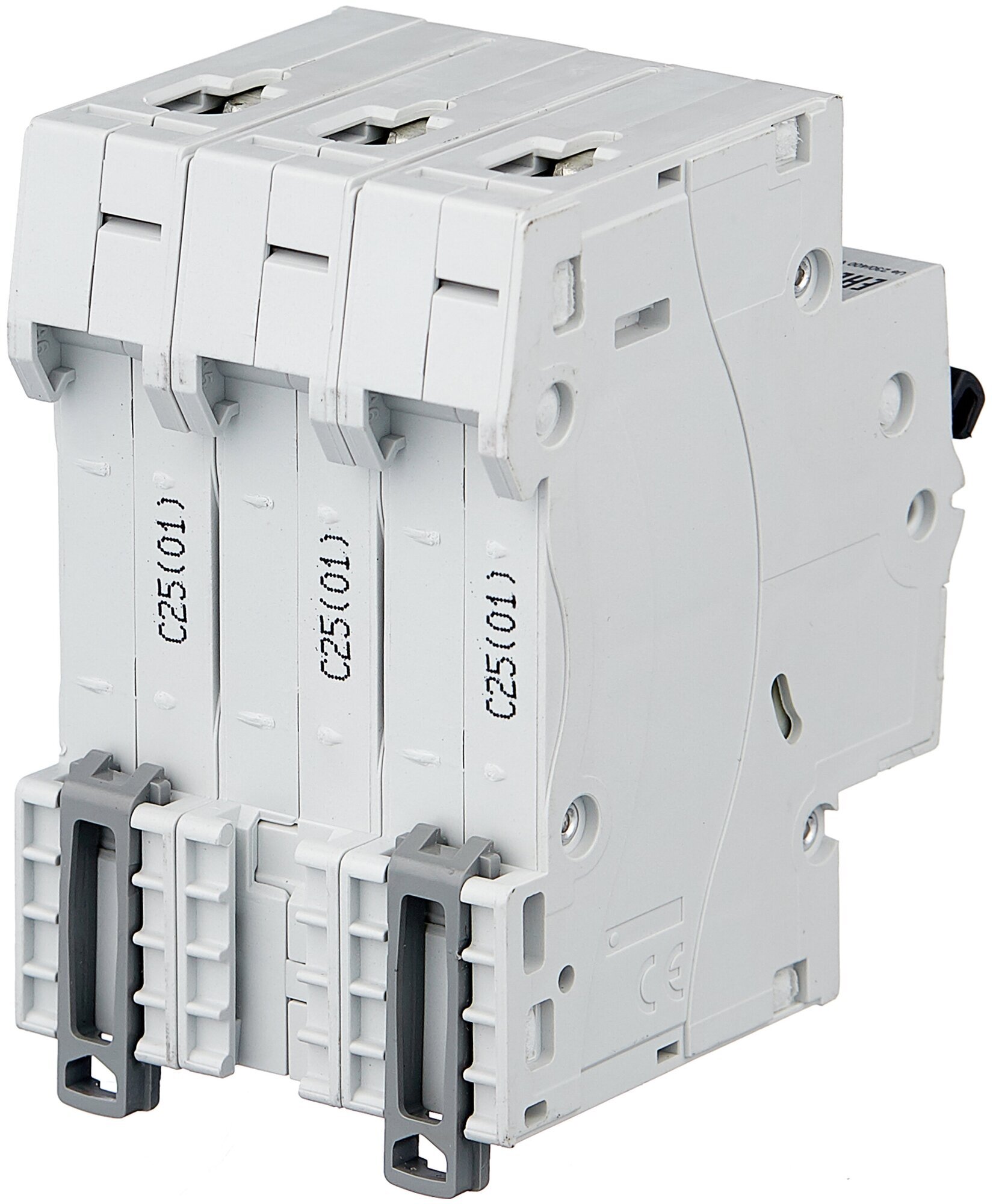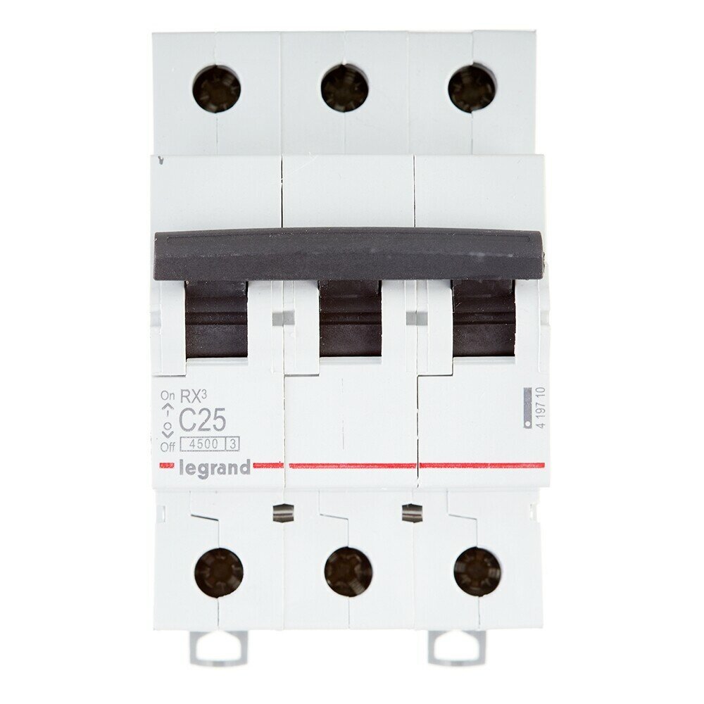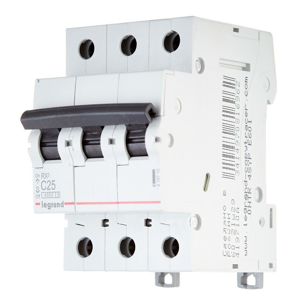 Трехполюсный автоматический выключатель Legrand RX3 типа C, рассчитанный на ток нагрузки 25 А и максимальную силу тока (отключательную способность) 4,5 кА предназначен для защиты электроприборов от поломок при перегрузках электросети или коротком замыкании. Устройство замеряет показатели электрического тока в непрерывном режиме и в случае его превышения срабатывает расцепитель, который размыкает электрическую цепь. Автомат устанавливается в специальных электрощитках в жилых домах, офисных и производственных помещениях. Параметр отключающей способности трехполюсного автомата Legrand RX3 (4,5 кА) означает максимальную силу тока, при которой срабатывает автоматический выключатель. При превышении этого показателя корректная работа автоматики не гарантируется. Для грамотного выбора устройства по отключающей способности необходимо учитывать максимально возможный ток при коротком замыкании. В старых постройках используются приборы на 4.5, либо 6 кА. Для квартиры в новых домах стоит выбрать защитную автоматику на 10 кА. Обратите внимание: несмотря на похожую единицу измерения и одинаковые числовые значения, номинальный ток и отключающая способность – это разные показатели! Автоматические выключатели типа C наиболее распространены в бытовых сетях. Для того, чтобы произошло срабатывание соленоида электромагнитного расцепления, установленного в таком приборе, нужно, чтобы проходящий через него поток электронов превысил номинальную величину в 5 раз. Срабатывание теплового расцепителя при пятикратном превышении номинала аппарата защиты происходит через 1,5 сек. Сделано в России.