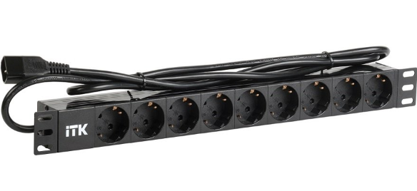 Блок силовых розеток 19" со шнуром 2 м., 9 розеток SCHUKO, шнур IEC 320 С14, AC 220 В/50 Гц, P max 2,2 кВт, I 10 А, 487х44,4х45 мм, алюминиевый профиль, цвет черный.