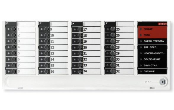 - 32 трёхцветных индикатора зон/устройств — каждый отображает статус: