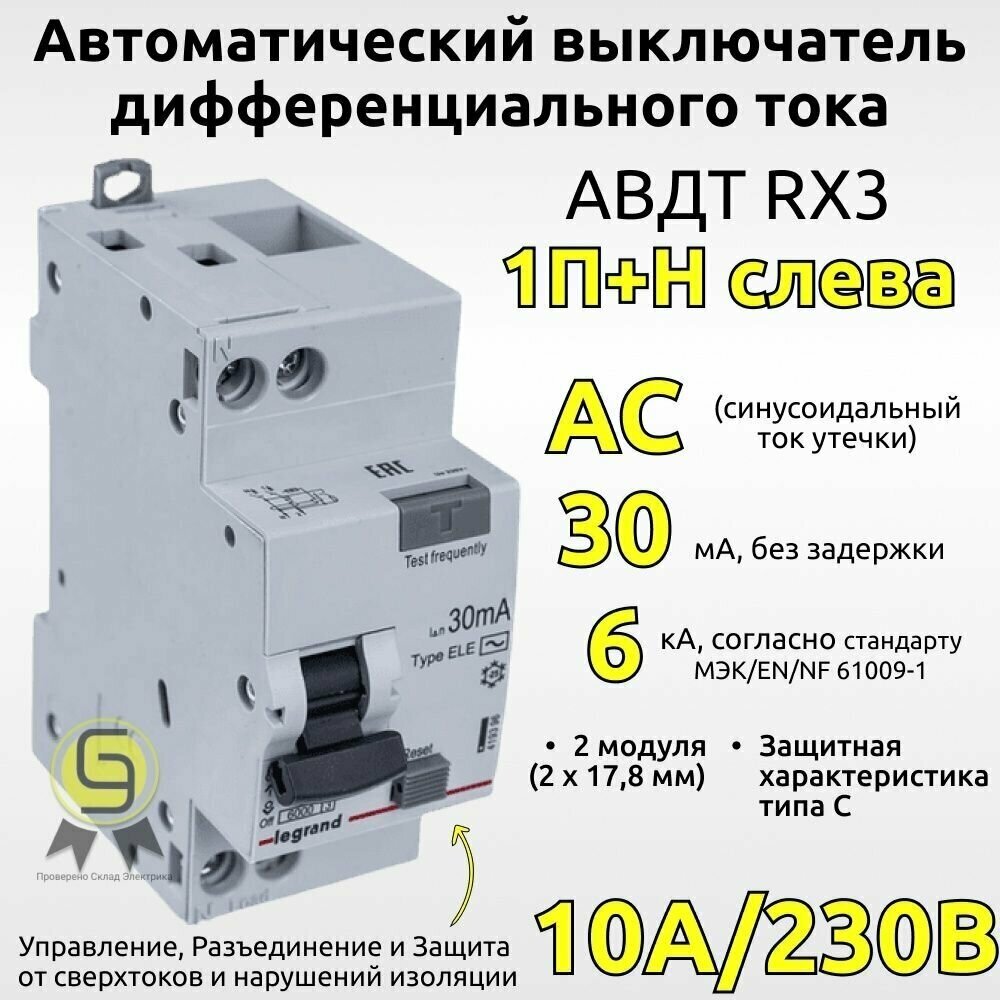 УЗО, Выключатель дифференциального тока Legrand RX3 1P+N 30мА 10А (AC) предназначен для защиты электрической сети от дифференциальных токов и перегрузок. В данном случае, "RX3" указывает на модель, "1P+N" означает однофазное исполнение с нейтральной линией, "30мА" указывает на чувствительность дифференциального тока в 30мА, а "10А (AC)" указывает на номинальный ток оборудования в 10А переменного тока. Этот выключатель чаще всего используется в электрических системах для защиты от токов утечки и может быть установлен в электрические распределительные щиты или монтажные панели.